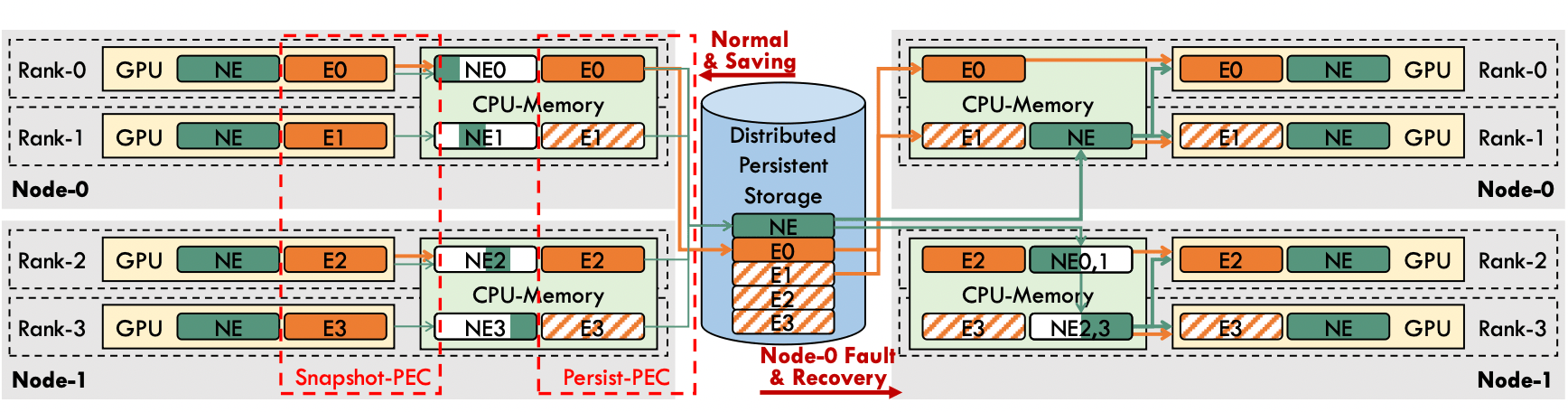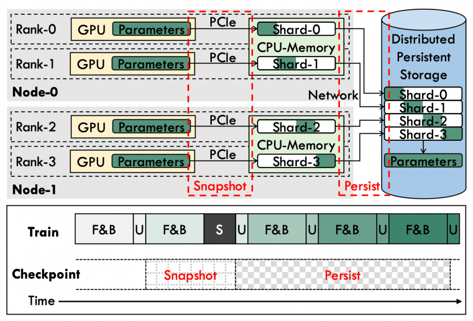 训练中会与 I/O 相关的点主要在于 Checkpoint,尤其是在大规模训练的时候,Checkpoint 不可或缺,且其开销也比较大的,在传统 dense 模型中就有过很多篇讨论把全量 Checkpoint 拆开,放在流水线 pipeline 的 bubble 过程中做的 paper(CheckFreq、Gemini),这里介绍一篇专门针对 MoE 做的 Checkpoint 优化。